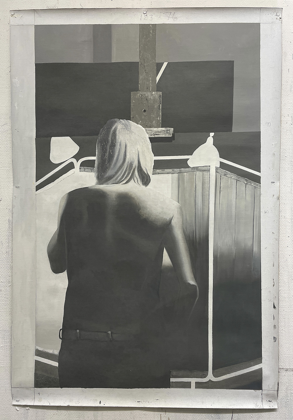 LG Lundbergs målning Sommaren 1973, 2024-2025, olja på duk, 123×76 cm – UNDER ARBETE.